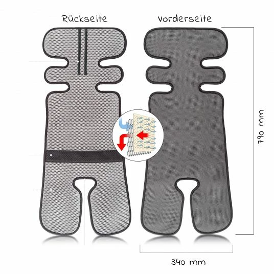 The seat cover of a buggy or child seat can often only be removed and cleaned with a lot of effort. The support is simply placed on the seat and can be removed just as quickly and washed in the machine. Your child always has a hygienic, clean seat.