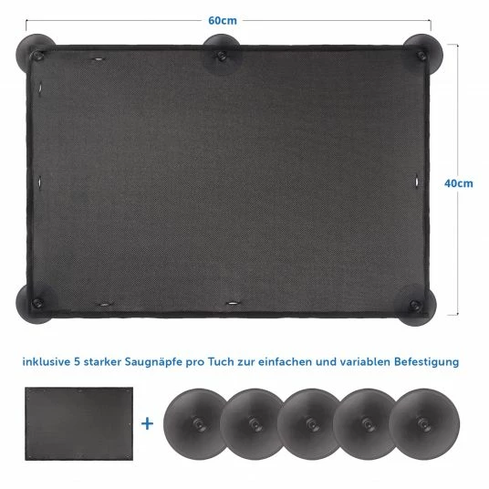 PROTECTION FOR EVERY WINDOW: The 60 x 40 cm baby sunscreen comes with 5 suckers and has several openings for housing. This allows you to adjust the sun visor variably to the shape and size of the side window.