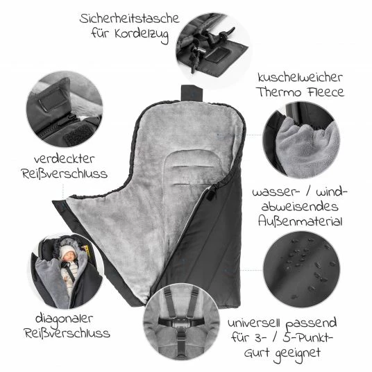 With the cuddly Footmuff Deluxe your baby will always be warm even in autumn and winter. The baby bag has 7 slits so it fits all common baby car seats and belt systems.